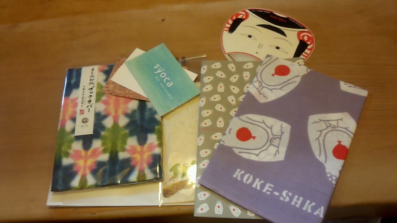 ブックカバーとしおりと手ぬぐいとその他もろもろお店の名刺やコケーシカで頂いたうちわです!